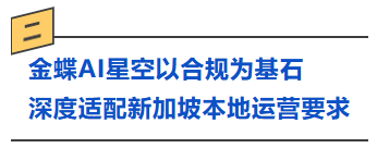为助力中企在新加坡快速落地合规运营,金蝶AI星空发布LocalKits新加坡财税包,打造适配新加坡本地的数字化合规解决方案,从财务核算、到电票直连、交易计税与纳税申报,提供关键能力支撑,满足企业本地化合规需求。