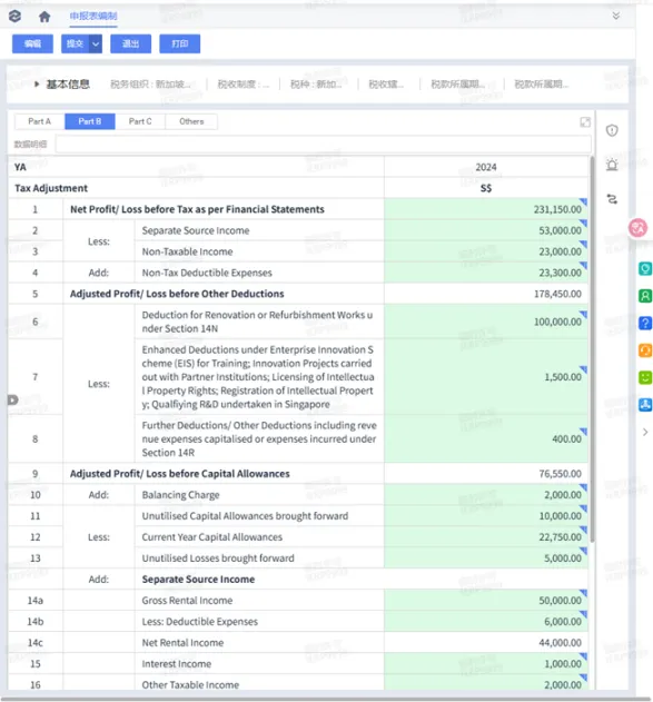 金蝶AI星空已满足IRAS官方 Accounting Software Register Plus(ASR+)认证技术要求,并对齐推荐的数字化能力框架。在交易环节,系统自动获取业务单据中的交易发生地、业务产品与税务资质等关键信息,自动完成税务判定,实现税种、税率、税额等关键要素的自动化计算,为期末申报提供 GST 申报表同源数据。在CIT申报环节,根据取数配置自动进行CIT计税,提供CIT年度申报表(Form C-S)编制与审核、导出等能力。通过规则固化与过程留痕,帮助企业减少手工汇总与反复核对,显著降低合规申报成本。
